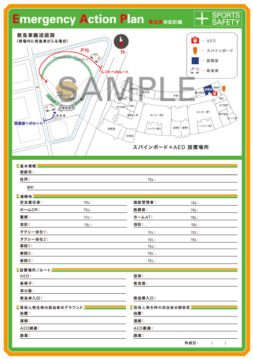 子どもの練習や試合を見に来たお父さん、お母さんでも、緊急事態と判断されたときに、救急対応をする指導者などのサポートとして、救急車の要請やAED(自動体外式除細動器)の調達、救急隊の誘導などを確認しながら対応できるようにする計画書です。