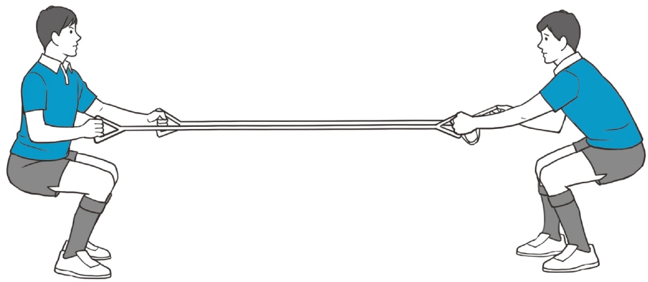 スクワットポジションを取り、綱またはタオルを左右の手でしっかりと握りながら、交互に引っ張ったり引っ張られたりしながらスクワットの姿勢を維持する。向かって左の人の姿勢はよい姿勢で、右の方は悪い姿勢である。