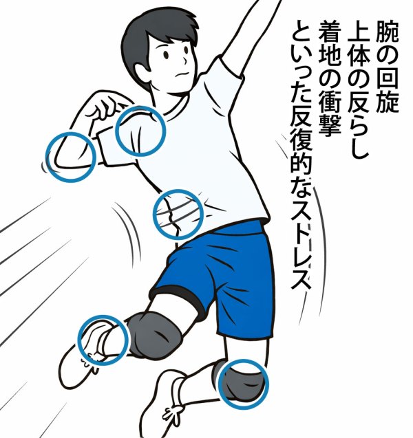 これに加えてスポーツ安全保険では補償対象とはならない、オーバーユース(練習のやりすぎ)が原因での障害が多いのがバレーボールの特徴です。オーバーユースでは痛みを抱えながらもプレー続行可能な場合が多いので、練習の休止時期の判断が難しいです。